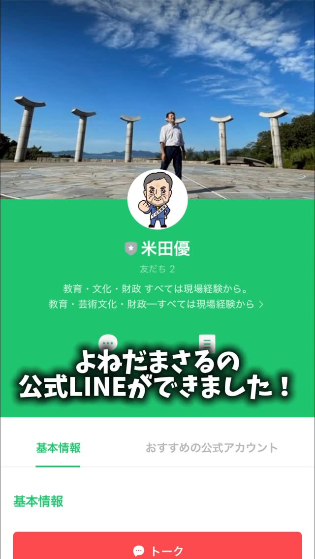 ・ 【LINE公式アカウント開設しました📣】 高松市議会議員・米田優のLINE公式アカウントを開設しました! 市政での活動や、地域の出来事、日々の気づきなどをより身近に、よりタイムリーにお届けしていきます。 また、LINE限定で「教育・芸術文化・財政」など、ご関心のあるテーマに合わせた情報もお送りします。 ぜひお気軽にご登録ください✨ https://www.instagram.com/reel/DLtEhZuz7Kl/